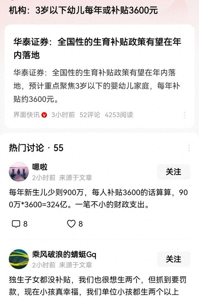 具体内容传闻是:2025年1月1日前出生的婴幼儿,只要不满三岁活着以下的幼儿家庭,每年发放育儿补贴3600元,也就是每个月300元,发到3岁满为止。那么计算下,这几年平均每年新出生900万左右的婴儿,那么按照此标准发放计算,全国财政需要增加支出324亿,这确实也是一笔大钱。这笔钱据说中央出大头,地方配小头。