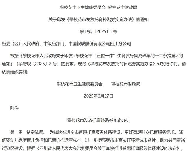 3.福利性补贴。政府养育未成年孩子的家庭提供一次性或定期的补助,这个也是在各个地方有着试点的,效果也是比较显著的。例如四川攀枝花市发放托育补贴券等等《攀枝花市“五位一体”生育友好集成改革的十二条措施》,最终城市净人口开始回升。而全国一些城市试点力度也是比较大,例如: